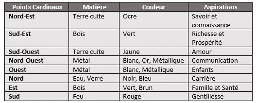 Pour vous aider un peu à situer chaque élément à son point cardinal, voici un petit tableau récapitulatif :