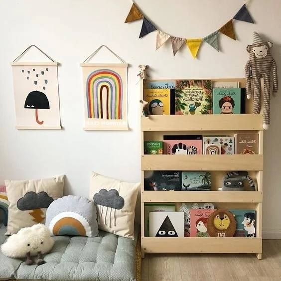 Cette espace peut y être mixé ou installé séparément, formé par des coussins, édredons et couvertures que l’enfant pourrait choisir lui-même. On y ajoute une petite étagère à livres illustrés avec quelques comptines et imagiés.